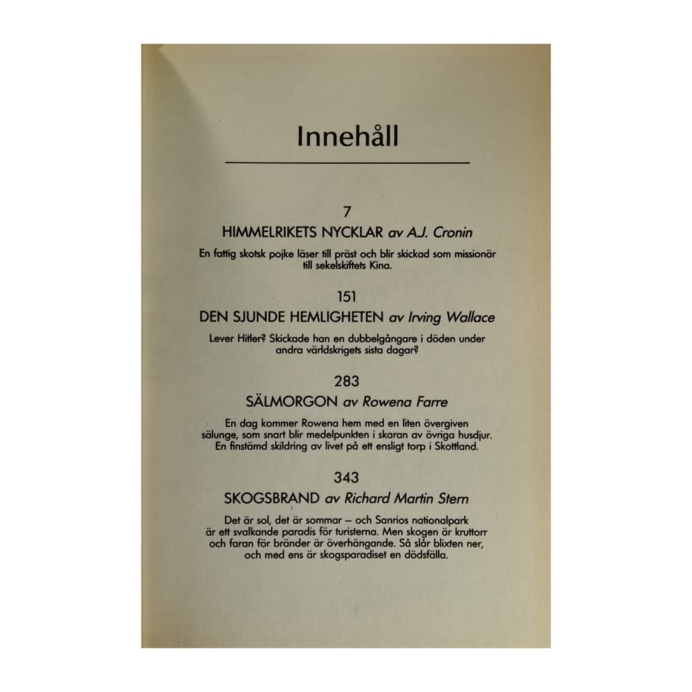 1- A.J. Cronin: Himmelrikets Nycklar + 2- Irving Wallace: Den Sjunde Hemligheten + 3- Rowena Farre: Sälmorgon + 4- Richard Martin Stern: Skogsbrand