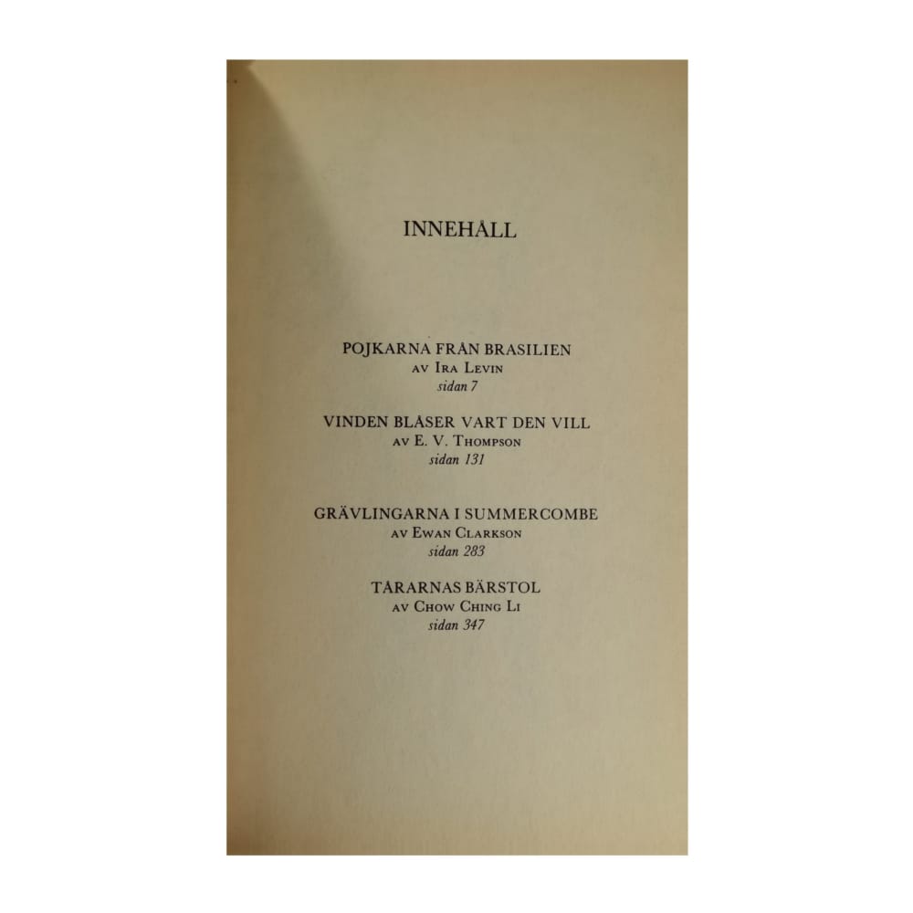 1- Ira Levin: Pojkarna Från Brasilien + 2- E.V. Thompson: Vinden Blåser Vart Den Vill + 3- Ewan Clarkson: Grävlingarna I Summercombe + 4- Chow Ching Li: Tararnas Bärstol