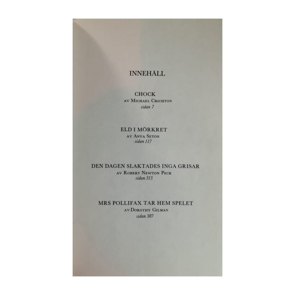 1- Michael Crichton: Chock + 2- Anya Seton: Eld I Mörkret + 3- Robert Newton Peck: Den Dagen Slaktades Inga Grisar + 4- Dorothy Gilman: Mrs Pollifax Tar Hem Spelet