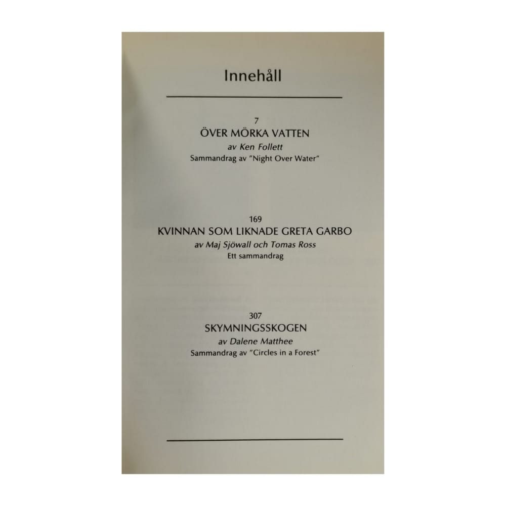 1- Ken Follett: Över Mörka Vatten + 2- Maj Sjöwall & Tomas Ross: Kvinnan Som Liknade Greta Garbo + 3- Dalene Matthee: Skymningsskogen