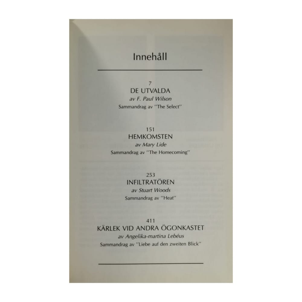 1- F. Paul Wilson: De Utvalda + 2- Mary Lide: Hemkomsten + 3- Stuart Woods: Infiltratören + 4- Angelika-Martina Lebéus: Kärlek Vid Andra Ögonkastet